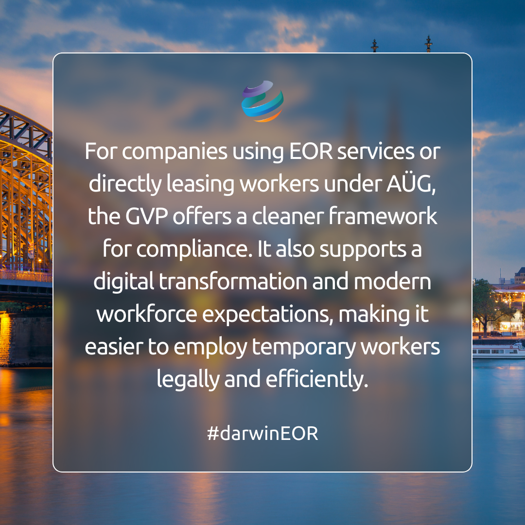 For companies using EOR services or directly leasing workers under AÜG, the GVP offers a cleaner framework for compliance. It also supports a digital transformation and modern workforce expectations, making it easier to employ temporary workers legally and efficiently.